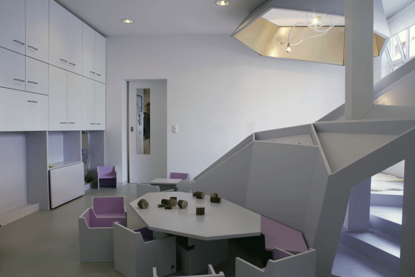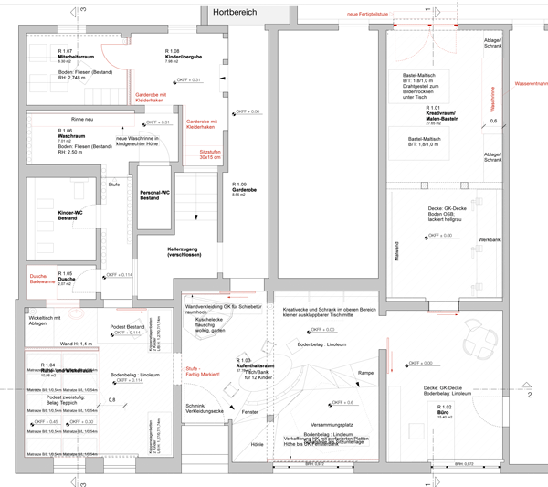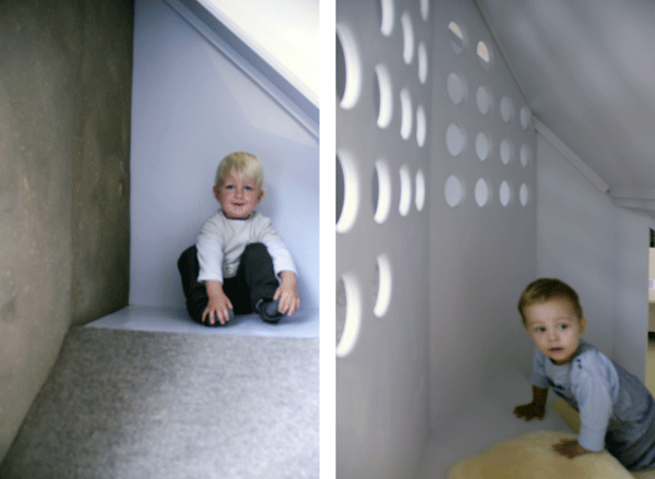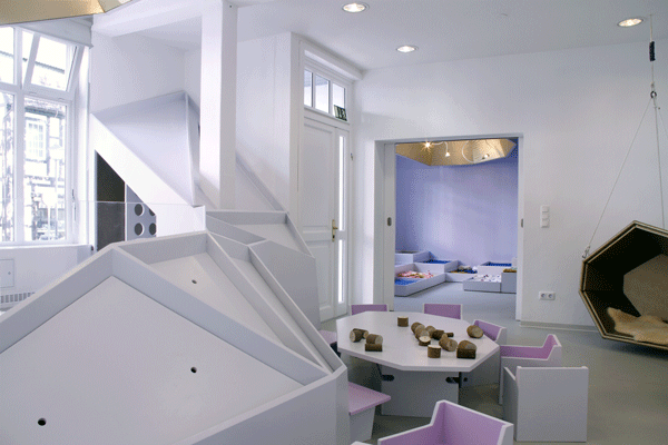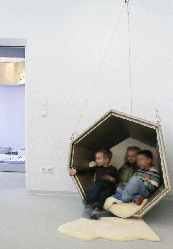 Das Entwurfskonzept lässt die Räume hell und klar erscheinen. Die Kinder sollen durch ihr Spielzeug und ihre Bilder den Raum selbst mit Farben bevölkern. Die Möbel sind aussen hellgrau und nach innen mit Lehm, Wollfilz und Kastanien ausgefüllt.