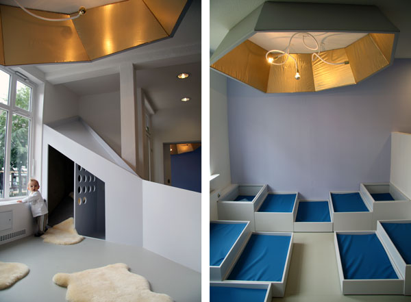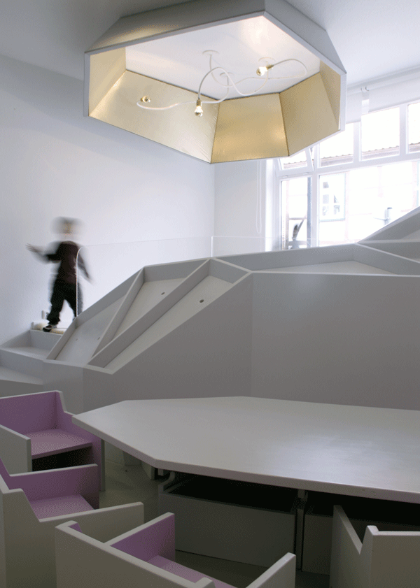 In einem Fachwerkbau wurden durch einen Umbau und Verlegung des Eingangs und des Büros neue Flächen für den Kindergarten gewonnen. Die neuen Räume haben wir für 12 Krippenplätze ausgebaut. Wegen des sehr begrenzten Platzangebotes wurden die Räume mit Funktionsüberlappungen geplant. Der Drachenschwanz, eine Skulptur, die den Raum teilt und verschiedene Funktionen übernimmt, organisiert den Raum. Er trennt den Spielbereich mit einem erhöhten Podest von den Verkehrsflächen mit dem Eßbereich. Im Drachenschwanz befinden sich eine Spielhöhle und Spielturm, ausserdem eine Fühlwannne, viel Stauraum und eine Nische zum Sitzen. Eine als Kelch geformte Kuschelecke bietet Platz zum Rückzug. Die großen goldglänzenden Schirme an der Decke behüten den Spiel- und Schlafraum und bringen Farbe in die ansonsten hell und einfarbig gehaltenen Räume.
