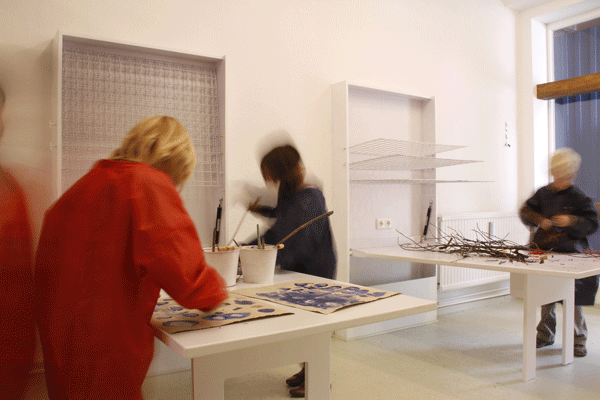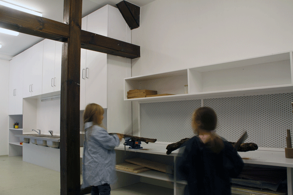 Unter und neben der Werkbank und einer Waschrinne mit drei Armaturen sind Abstellflächen für diverse Materialien, die den Kindern in einem Kinderkunstatelier jederzeit zur Verfügung stehen sollten.