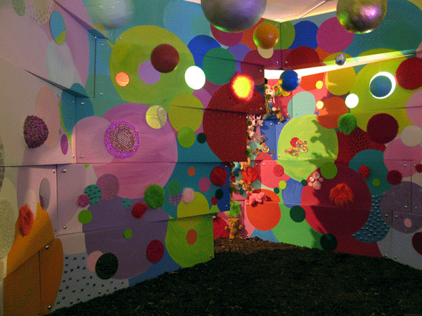 Aus Hunderten von kleinen und großen Punkten wird die Vielfalt der Farben und Oberflächen im Innenraum zu einem Ort unterschiedlichster Blickfelder und Sichtweisen, Fühlerlebnisse und Stimmungen.